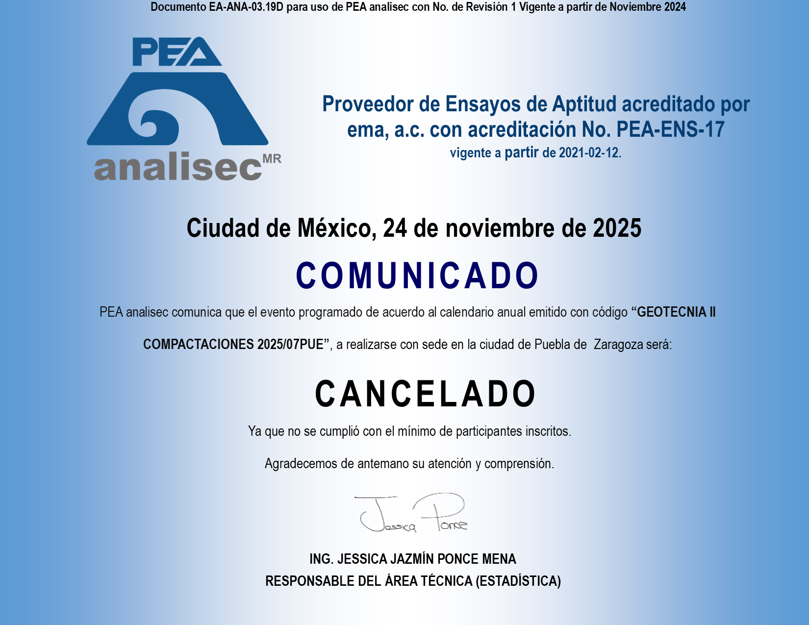 EA-ANA-03.19B COMUNICADO CANCELACIÓN